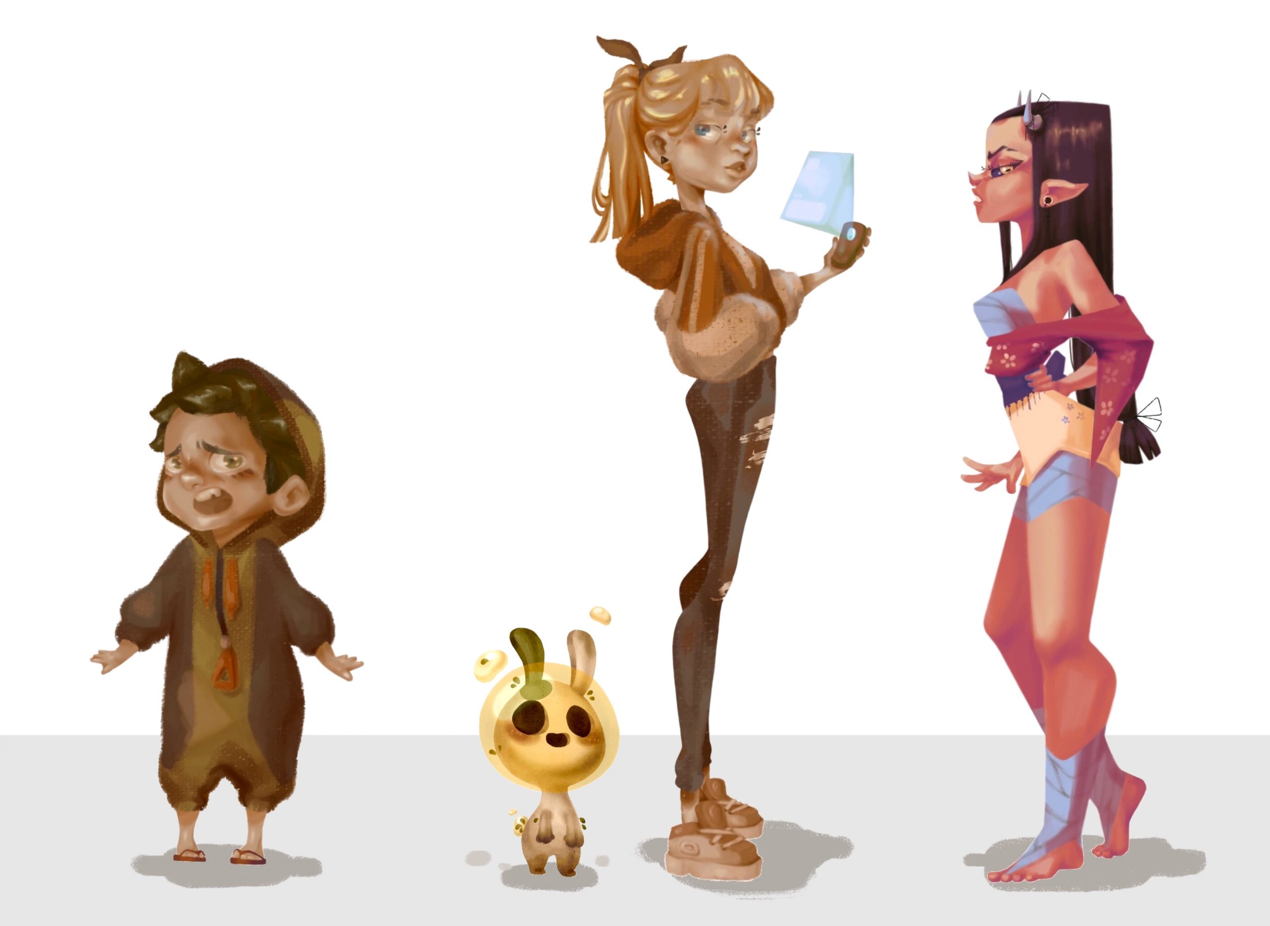Diseño de personajes y props, adaptando su forma y colores según el rol de cada uno.