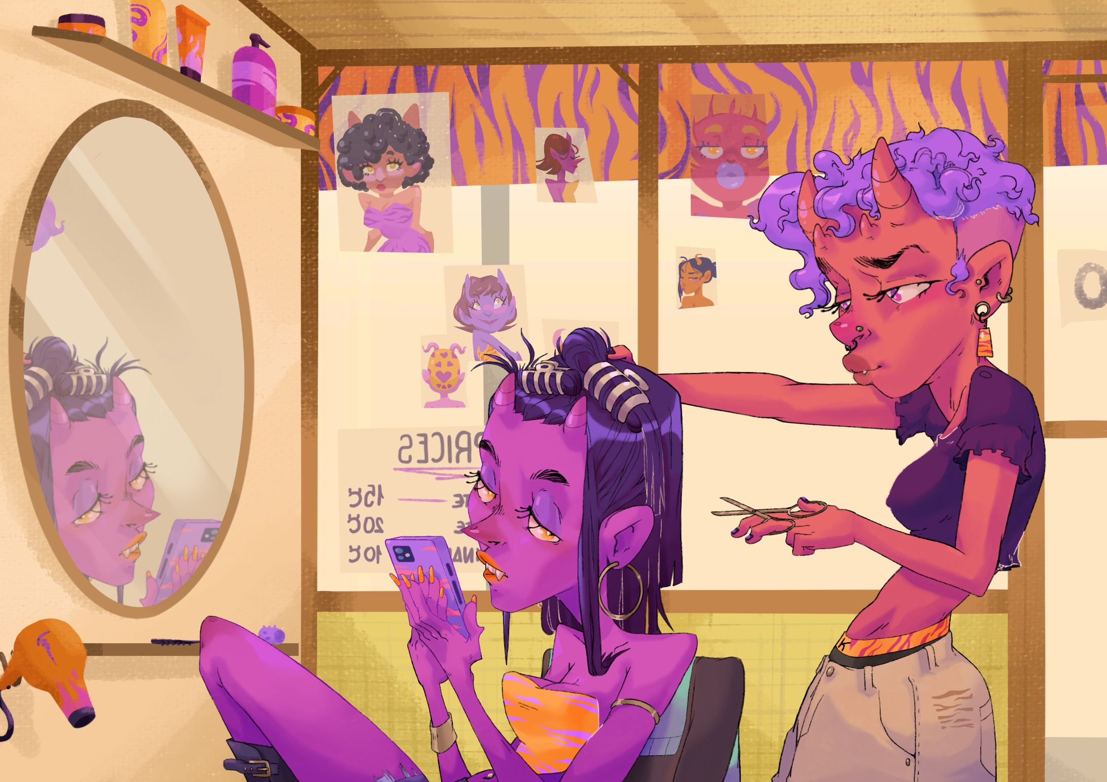 Ilustración sobre una peluquería de barrio en un universo de demonios japoneses.