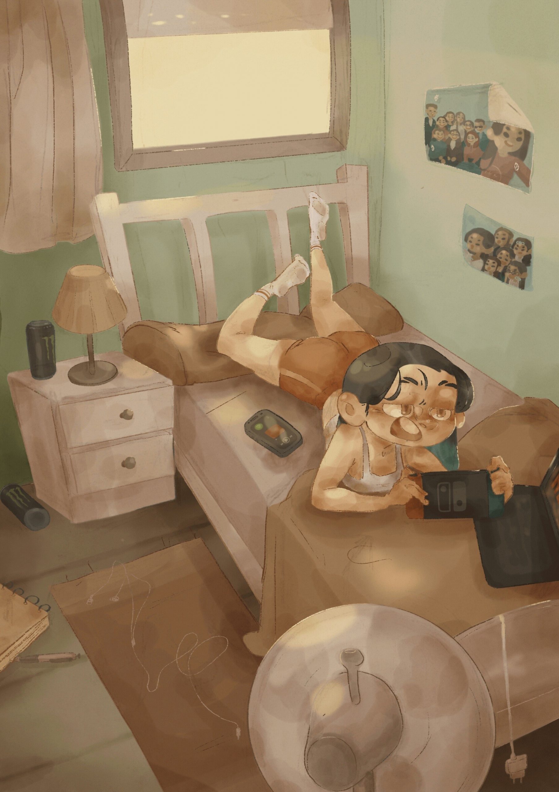 Ilustración y animación de una adolescente rodeada de pantallas en su habitación.