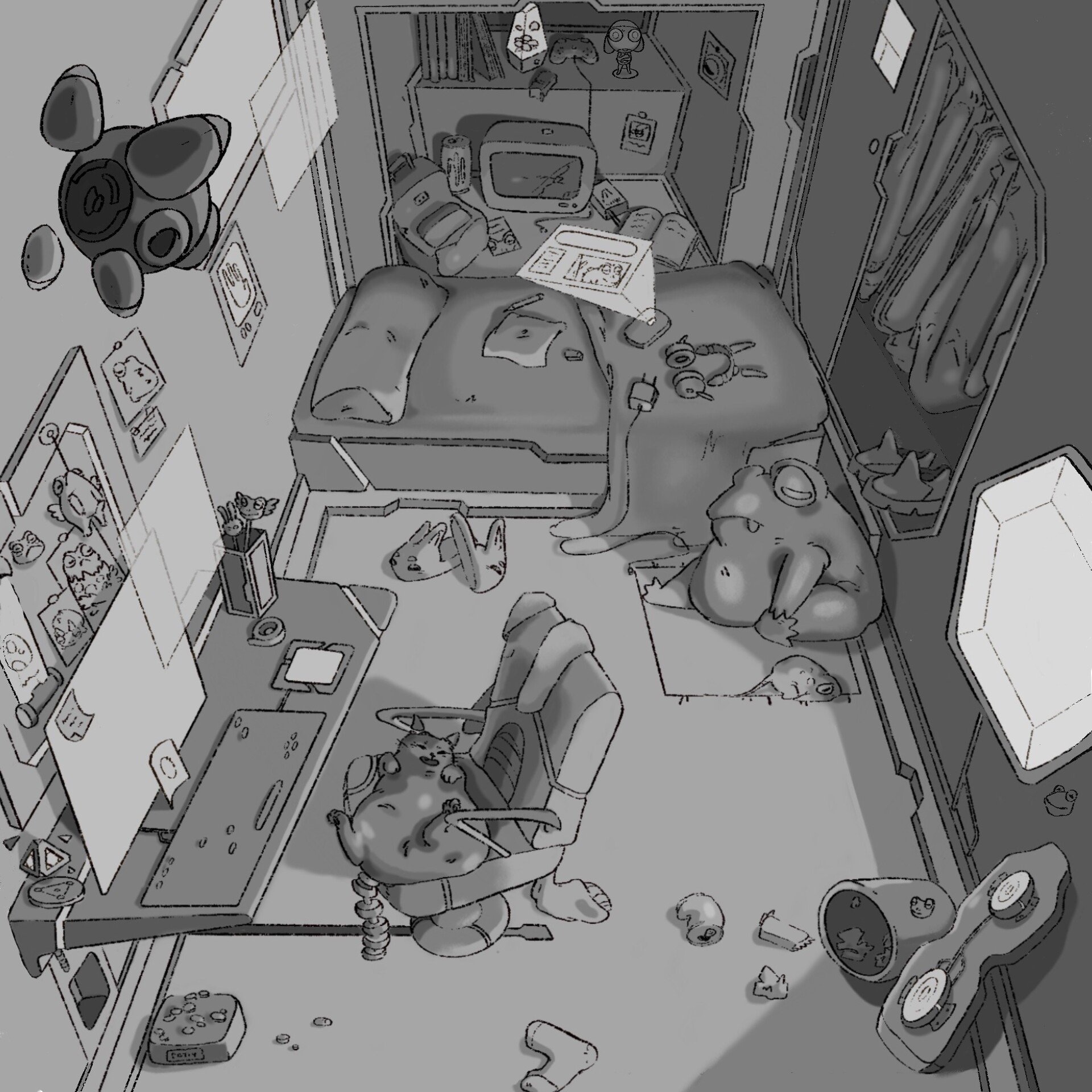 Concept art de la habitación futurista de una adolescente fan de las ranas.